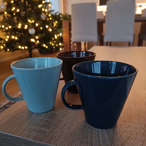 Iittala Koko kahvikupit, neljä kappaletta, sisältäen kaksi sun kahvimukia ja kaksi chocolate kulhoa. Kulhot on kokoa XS.