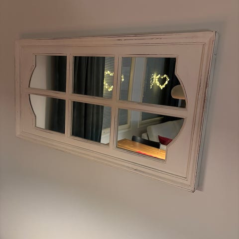 Puinen peili lipasto, joissa on luonnonvärinen viimeistely. Peilissä on yksinkertainen kehys ja lipastossa on vetolaatikkot säilytystilaa varten. Sopii käytettäväksi esimerkiksi eteisessä tai makuuhuoneessa.