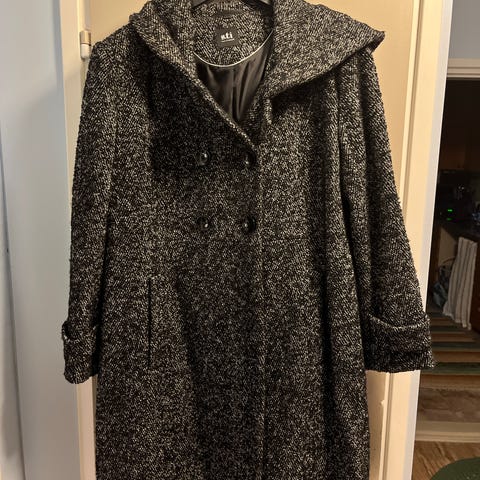 Mustavalkoinen, villakangasmainen välikausitakki. A-linjainen. Kainalo-kainalo n .58cm. Yksi nappi irti, tallessa.