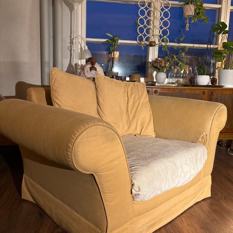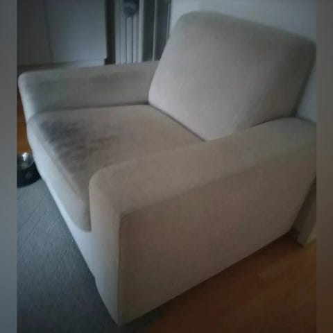 Kuvan nojatuoli, 40 luvulta, meriheinätäyte, kuparijouset, plyyshipäällys