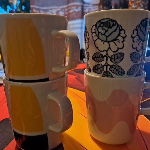 2 kpl Marimekon kahvikuppeja 12€/kpl sekä jälkkärikulho(5dl) 15€.