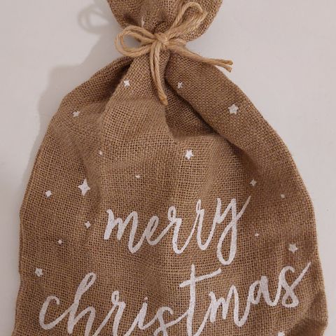 Iso lahjapussi/juuttikassi punaisella kiristys nyörillä.