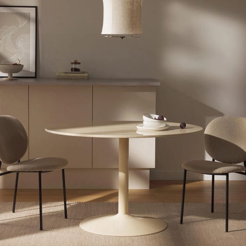 Tuolit ovat beigen väristä boucle-/tekstiilipintaa, mustilla metallijaloilla. Erittäin mukavat ja tukevat istua.