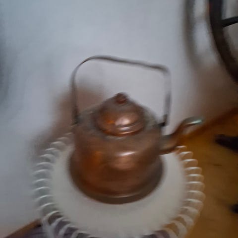 Pieni kuparipannu jossa ripa ei käänny alas. Ollut koristeena kirjahyllyssä.