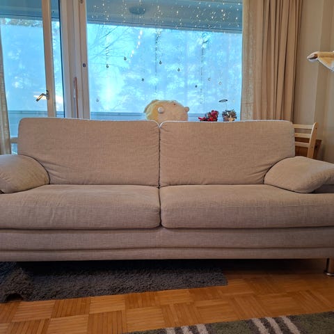 Liias Paris suomalainen hyväkuntoinen kahdenistuttava sohva. Koko 210 x 90 cm, korkeus 85 cm, istuinkorkeus 45 cm. Kestävä vaaleanharmaa kangaspäällinen, jossa puhdistettava Soft Touch pinnoite. Tukeva puurunko, no-sag jousitus ja muotonsa hyvin säilyttävät kylmävaahtoistuimet. Myydään muuton vuoksi.