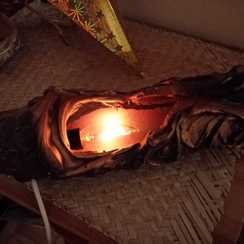 Myydään punainen vanha lamppu. Sähköosia kannattaa varmaan tarkistella tai uusia, vanha pyöreä töpseli joka ei sovi moterniin pistokkeeseen. Tosi isolle lampunkannalle. Torin tekoäly antoi merkiksi fog mörup, voi olla tai sitten joku muu.