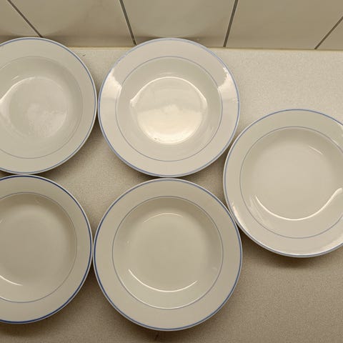 Myydään 2kpl Arabia Siniraita syviä lautasia. Lautasissa erilaiset leimat. Piippuleimaisessa lautasessa alareunassa pieni lohkeama, ei näy yläpuolella.