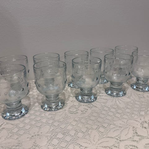 4 kpl Riihimäen lasin Kirsi -snapsilasia. Suunnittelija Nanny Still. Koko 1L, kork. 21cm. Vain vuosia vitriinissä seisseet.