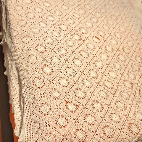 Peitteeseen tuli värieroja johtuen lankojen värjäyseristä. Olen peitteen sittemmin värjännyt, mutta värierot eivät tasaantuneet täydellisesti.