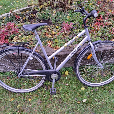 Huollettu ja kunnostettu laadukas Nopsa Promenade 7 -kaupunkipyörä. Rungon koko 57 cm (sopii noin 170–185 cm pyöräilijöille) ja renkaiden koko 28". 7v Shimano Altus -vaihteisto ja tehokkaat V-jarrut.