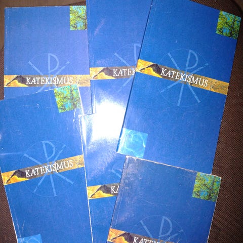 Suomen Evankelis-Luterilainen Kirkko Katekismus, hyväksytty Suomen kirkolliskokouksessa vuonna 1948, painettu vuonna 1949. Kirja sisältää kirkon opetuksia ja on painettu Suomen Sanomain Kirjapainon toimesta. Kirjan kunto on käytetty. Innokkaan käyttäjän lyijykynämerkintöjä jonkin verran muistin tueksi.