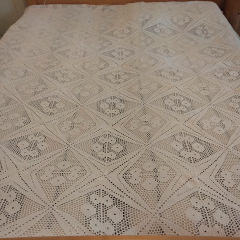 Kalalangasta virkattu päiväpeitto. Koko 130x210 cm. Jos peitto postitetaan, postikulut lisätään.