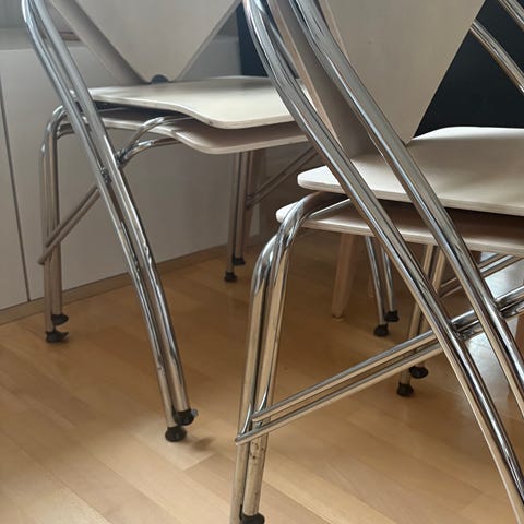 Siisti iso koivurakenteinen valkoinen pöytä, jossa kauniit viisteet, joista pöytä on saanut nimensä. Tuoleissa muutamia pieniä käytönjälkiä. Istuinosat ovat puhtaat. Jatko-osa on tullut hiukan kellertäväksi. Täyskoivuisena kestää vuosia. Painava rakenne.