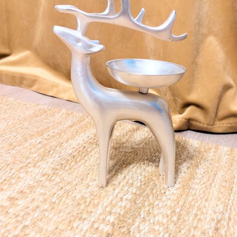 Metallinen pentikin Aslak-poro kirkkaalla tuikkulasi astialla. Korkeus sarvien kohdalla n. 16cm/syvyys n. 9,1cm, leveys keskellä n. 16,5cm. Käyttämätön.
