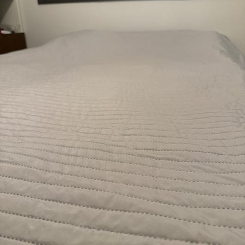 Tummanharmaa Hemtexin päiväpeitto. Sopii 160–180 cm sänkyyn. Päällisosassa on jonkin verran valkoista nukkaa, joka lähtee helposti.