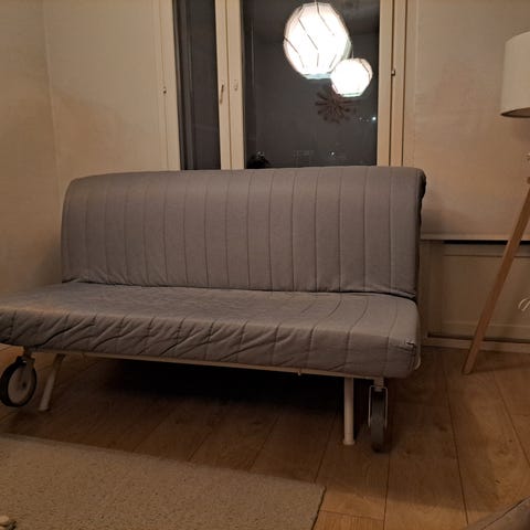 IKEA puolipyöreä vuodesohva, jossa valkoinen kangaspäällyste. Sohvassa on pyöreä muoto ja selkänoja, joka voidaan tarvittaessa kääntää tai irrottaa. Sopii tilaan, jossa tarvitaan monikäyttöistä istuin- ja makuuhuonekalua. Mukaan halutessa sängynpääty.