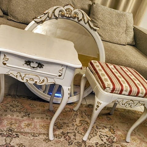 Pöytä, peili ja jakkara setti valkoisella ja kullansävyisellä koristeella