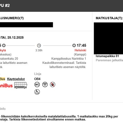 Onnibus liput 3 kpl OB5-linjalle joulun liikenteeseen 20.12. - 26.12.