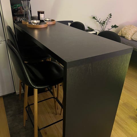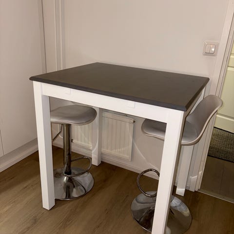 Elloksen nettisivuilta ostettu korkea ruokailupöytä sekä kaksi baarijakkaraa/-tuolia. Myyn muuton takia pois.