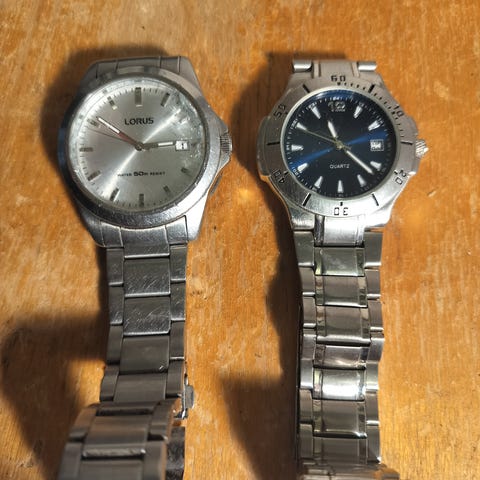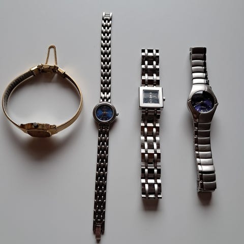 Kaikista patterit loppuneet ajat sitten. Käyneet patterien loppumiseen asti paitsi Camel (harvinainen) joka ei käy. Kellosepällä sitä vuosikymmeniä sitten näytettyä muistaakseni kertoi että kait pitäisi uusia koneisto, ei uusittu. Täysmetallinen hopenvärinen sinisellä kellotaululla olevassa kellossa ei lasia.