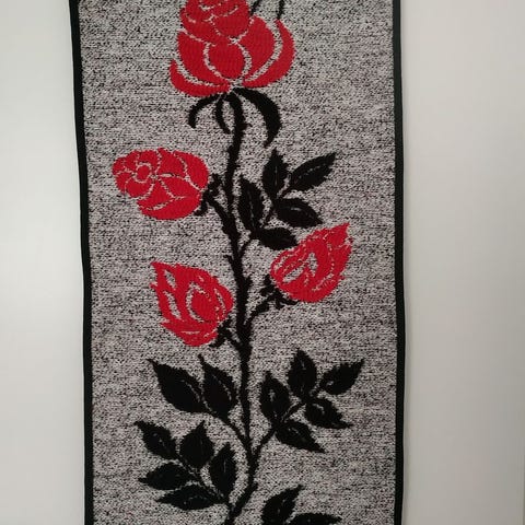 Hanhisalon Kutomo , Alajärvi. Koko: 40 x100cm. Puiset ripustustangot ylä- ja alareunassa. Nouto