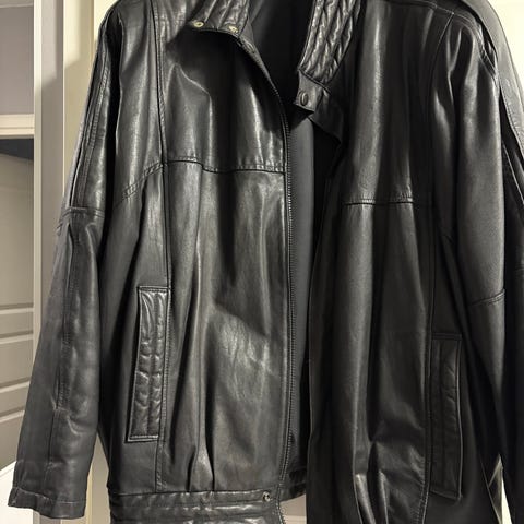 L-koon musta nahkatakki vyöllä, jossa on selässä pääkallo painatus. EMP:ltä ostettu.