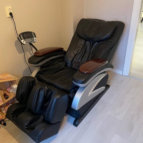 Hierontatuoli mustalla keinonahkapäällysteellä. Tuolissa on selkänojan ja istuimen hierontaominaisuudet, ohjain mukana. Sopii rentoutumiseen ja lihashuoltoon kotikäytössä.