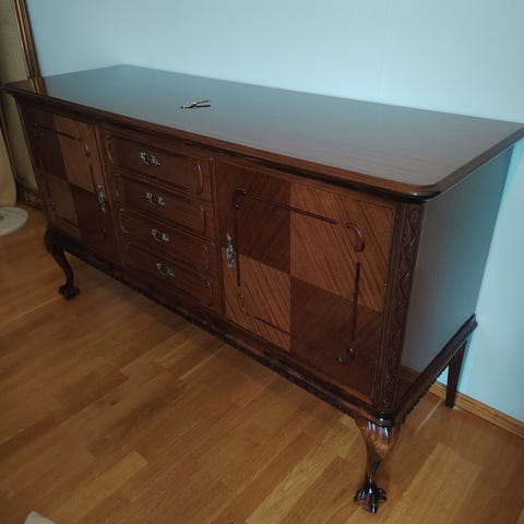 Antiikkinen puinen senkki, jossa on koristeellinen pinta ja avainlukko. Huonekalu soveltuu säilytykseen ja sisustukseen, ja sen materiaali on puu. Sopii esimerkiksi olohuoneeseen tai ruokailutilaan.