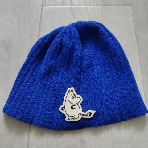 Sininen pipo muumipeikon kuvalla, kuva edelleen hyvin kiinni, pinnassa haitua, ehjä ja tahraton. Pesulappu leikattu, koko siis arvio.