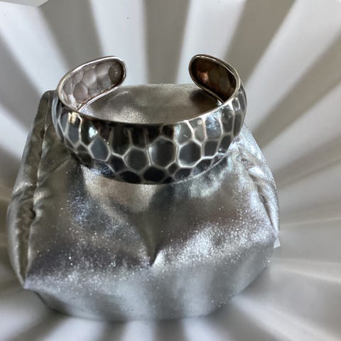 Hopeinen rannerengas vuodelta 1959, spektroliitillä. Valmistaja Taidehopea, Turku.