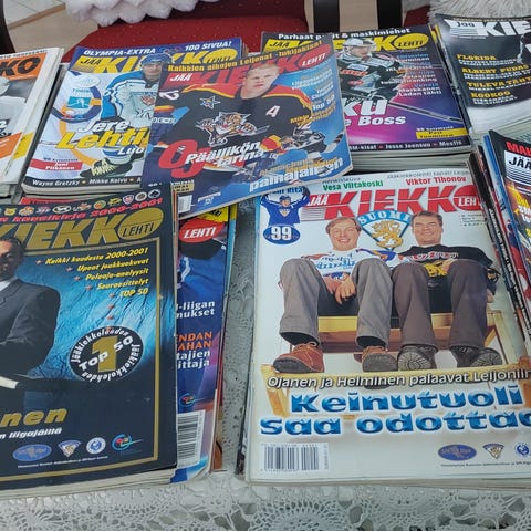 Jääkiekkokirja, tämän nimistä teosta on sekä isommat tuoreemmat mallit, jotka ovat hyvässä kunnossa, vuosilta 1993-2016 (nrot 33-55). Ovat näköjään olleet aikoinaan kalliita kirjoja.