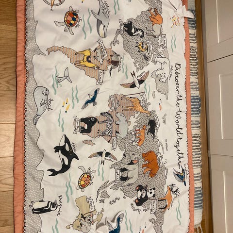 Siisti ja ehjä leikkimatto sekä useita vauvan leluja ja pehmokirja. Sopii pienelle vatsallaan ja selällään leikkimiseen. Ei tahroja, kotona pidetty normaalissa käytössä.