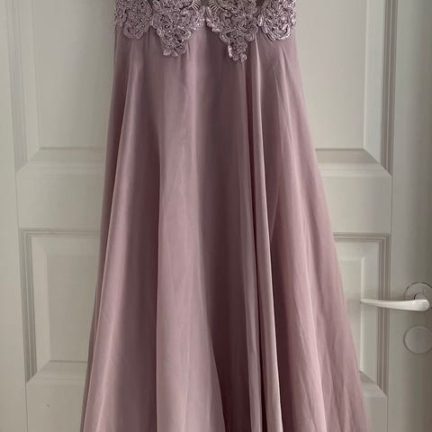 Väri kaunis violetti, helmikoristelut. Piilovetoketju selässä. Mukaan huivi sekä olkaimet, toisesta olkaimesta puuttuu yksi hakanen.