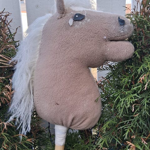 Vaalea keppihevonen, käytetty kauan joten siihen nähden mielestäni kuitenkin hyvässä kunnossa. Toisesta silmästä lähtenyt valkoinen osa (kuvassa) ja suu ei oikein pysy kiinni kun suitset on päässä ellei ole turparemmiä. Korvissa ei ole kovikkeita. Myydään ilman keppiä.