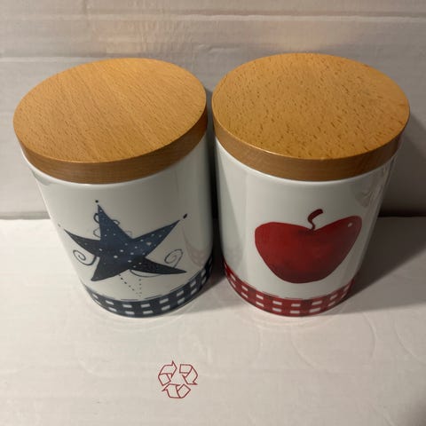 Arabia "Sininen keittiö"- purkki. Kork. 85 mm, halk. 100 mm. Suunnitellut Raija Uosikkinen.