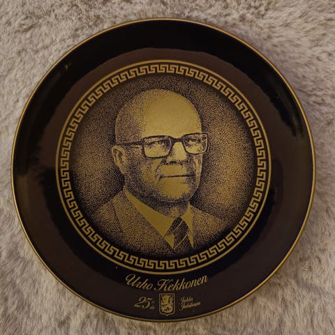 Lautanen on tehty Urho Kekkosen 25-vuotisen presidenttikauden kunniaksi. Lautasen on piirtänyt Veikko Roininen ja se kuuluu sarjaan SUOMEN PRESIDENTIT.