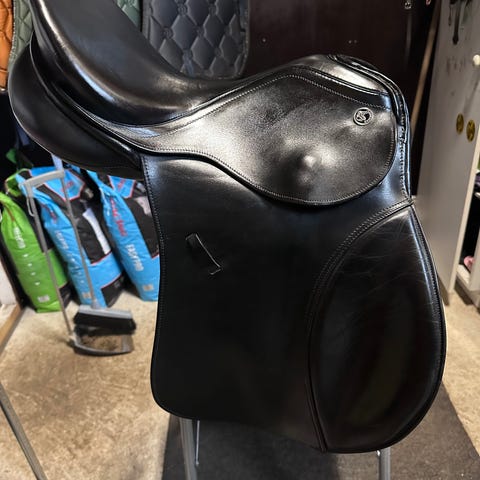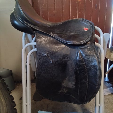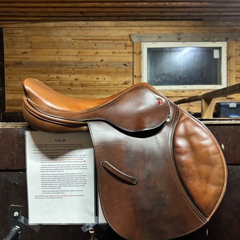 Ruskea Jeffries merkkinen englantilainen laatusatula ponille. U mallinen etukaarin istuu pyöreään selkään. Leveys Wide. Etummaiset vastinhihnat lähtee heti rungon päistä jotta satula ei valu eteen. Hyvä rangantila ja laakeat paneelit. Toppaukset vielä hyvässä kunnossa. Käytön jälkiä pinnassa. Vastinhihnat uusittu vasta toiselle puolelle. Runko on suorahko. Paneelien pituus selkää vasten 38cm.