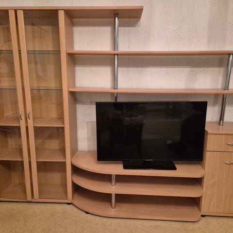Annetaan kuvan mukainen kirjahylly, kokonaispituus 208 cm, maksimi korkeus 183 cm ja kaappien syvyys 40 cm, TV-tason syvyys maksimi 50 cm.