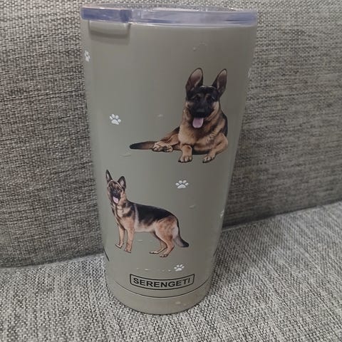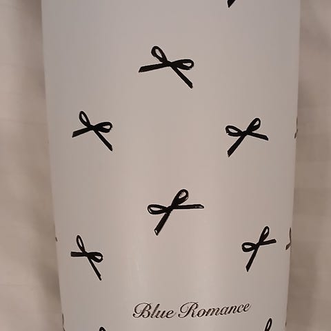 Termosmuki tekstillä. Halkaisija noin 10 cm. Korkeus noin 10 cm. Jäänyt käyttämättä, kunto uutta vastaava.