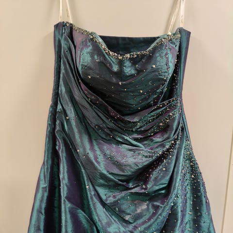 Zazabellasta ostettu, yhdet iltajuhlat päällä ollut kaunis olkaimeton iltapuku. Menee hyvin myös vanhojen tanssimekoksi. Kunto kuin uudessa huolimatta ihan helmasta löytyviä kolme pientä kohtaa (kuvat), joissa ilmeisesti toisen korko raapaissut. Käytössä eivät näy lainkaan runsaasta helmasta.