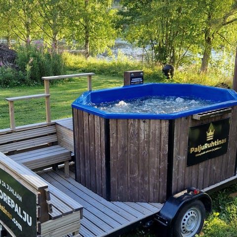 Eristetty palju kärryssä. Kesällä kun viimeksi vedettiin niin valot toimi. Ledivalot kaiteissa. Kannen eristeet voisi uusia, eikä kannen vaneritkaan uusia ole. Voi olla jotain muutakin pikkuvikaa mutta ei haittaa paljuttelua. Pesen paljun viikonloppuna.