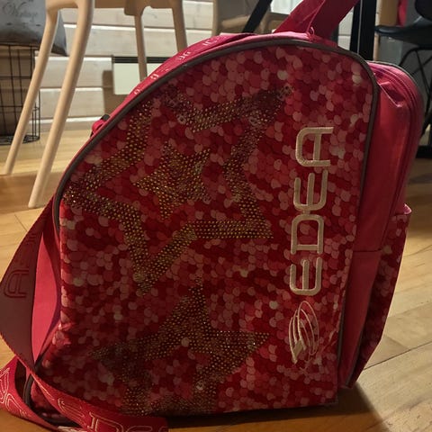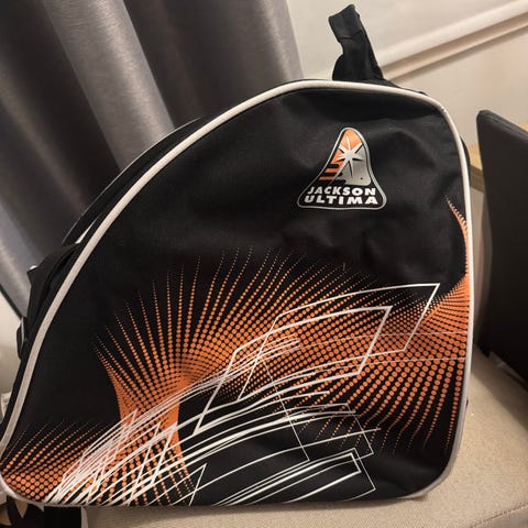 Intermezzo vedettävä luistinkassi pyörillä. Ulosvedettävä kahva, joten on helppo vetää perässä tai kantaa. Reppumallinen eli voi kantaa myös selässä. Käytönjälkiä on, mutta hyvässä ja siistissä kunnossa. Mukaan saa siniset luistinsuojat.