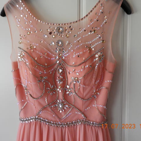 Myydään vähän käytetty maksimekko kokoa S. Edessä kiiltäviä lasihelmiä tms. strassin tyyppisiä. Takana vetoketju ja hakanen. Kangas sifonkia ja silkkinen alushame.