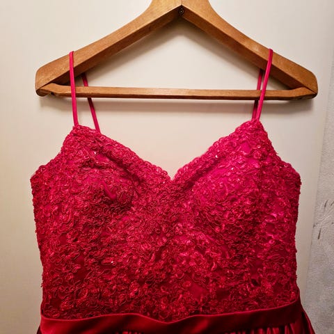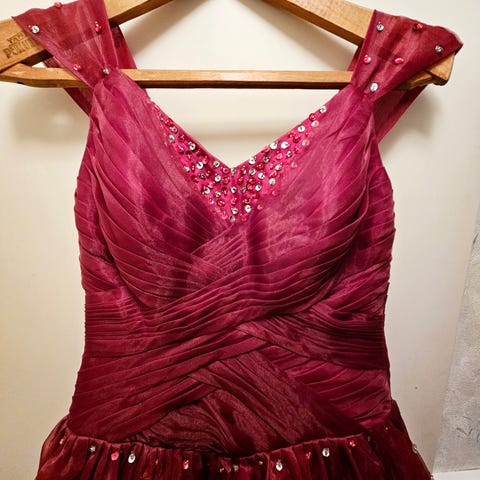 Kerran käytetty vanhojentanssimekko erinomaisessa kunnossa. Kokoa S/M, mutta selän nyörityksen avulla saa säädeltyä myös isompaan tai pienempään kokoon. Rinnassa toppaukset.