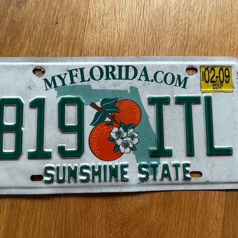 Florida Sunshine State Metallinen rekisterikilpi, jossa punaiset ja mustat numerot ja kirjaimet valkoisella pohjalla.