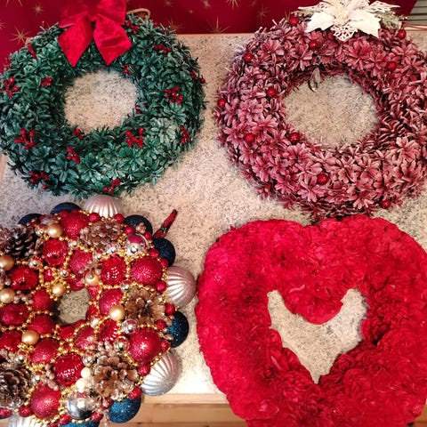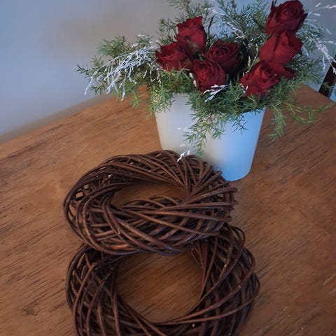 Käpykranssi ja kaksi neuleella päällystettyä styroxkranssia. Neulotuista puuttuu koristelu, saa tehtyä mieleisekseen. Suurimpien halkaisija 25cm ja pienin 20cm. Kransseilla yhteishinta.