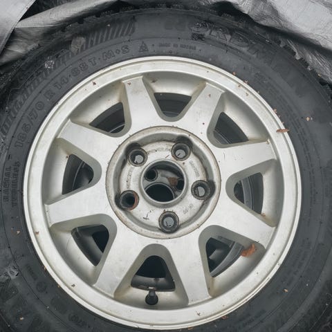 Renkaat vanteilla. Kuvassa näkyy neljä rengasta alumiinivanteilla. Renkaiden koko ja muut tekniset tiedot eivät ole saatavilla kuvasta.