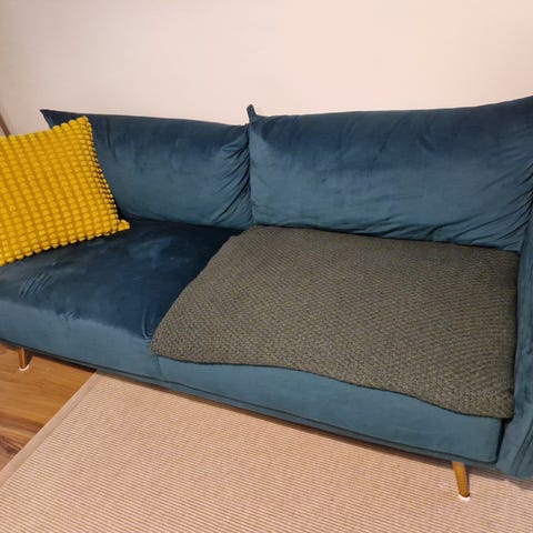 Vaalea kahden istuttava alcantara sohva. Perus siisti, muutama läikkä löytyy. Lähtee ehkä pesemällä!
