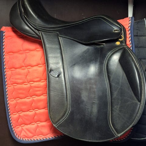 Suoraan käytöstä uudenveroinen synteettinen Euro riders yleissatula 17". Suora runko, hyvä säkätila ja selkärangantila. Toppaukset ok kuntoiset. Siirrettävät polvituet. Satula on vaihtokaarellinen ja nyt satulassa on paikallaan vihreä kaari.