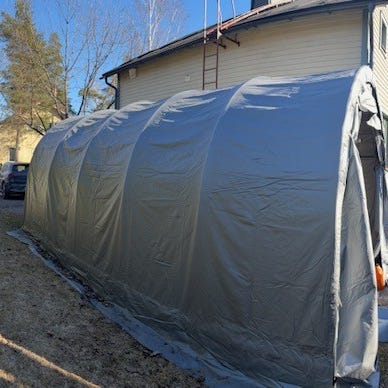 Kuvienmukainen 4x6m autokatos purettavaksi ja pois kuljetettavaksi. Peltikatto, hyväkuntoinen.